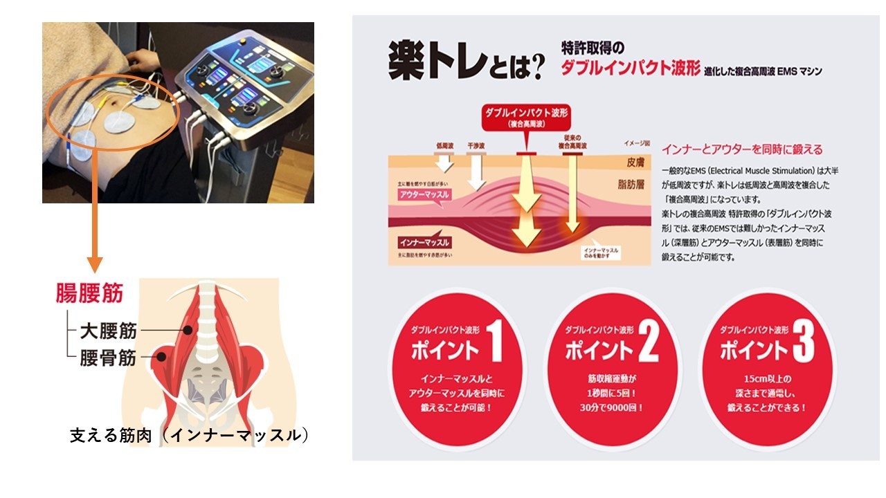 慢性的な腰痛でお悩みが何年も続いている方で、病院で特に異常がないと診断を受けている方は、インナーマッスルである腸腰筋が著しく低下している恐れがあります。そのような場合、楽トレで腸腰筋を刺激し、トレーニング施術と併用されると、姿勢が改善され腰痛や膝痛の解消にもなります。ダイエット(見た目)にも変化が現れます。結果として痩せている状態になります。